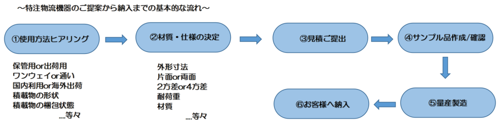 当社では木製パレットを始めとして、木材、樹脂、金属、段ボールを原材料とした物流機器のご提案を行っております。